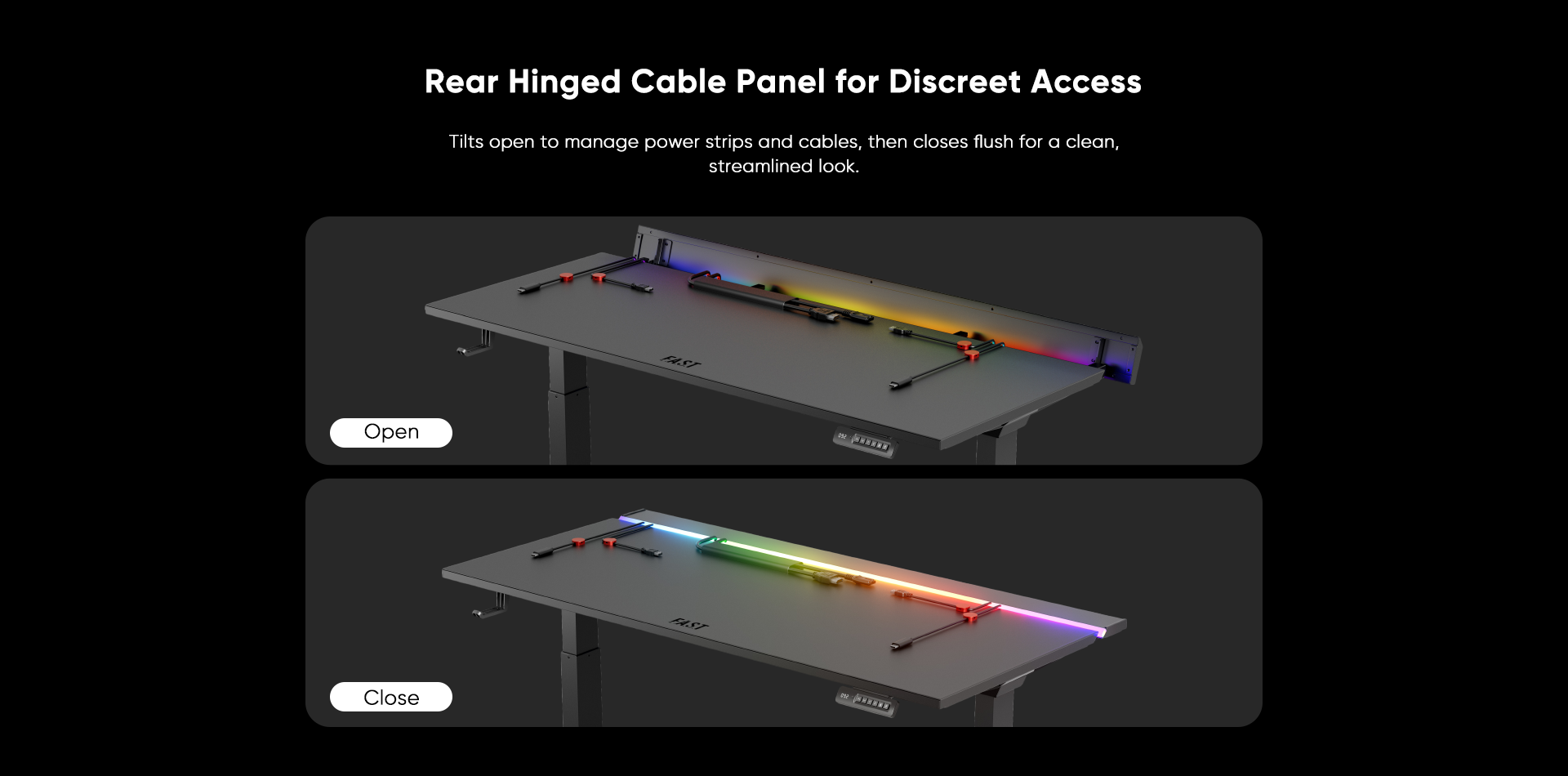 Rear hinged cable panel and full-sized cable management compartment keeps your space clean and tidy