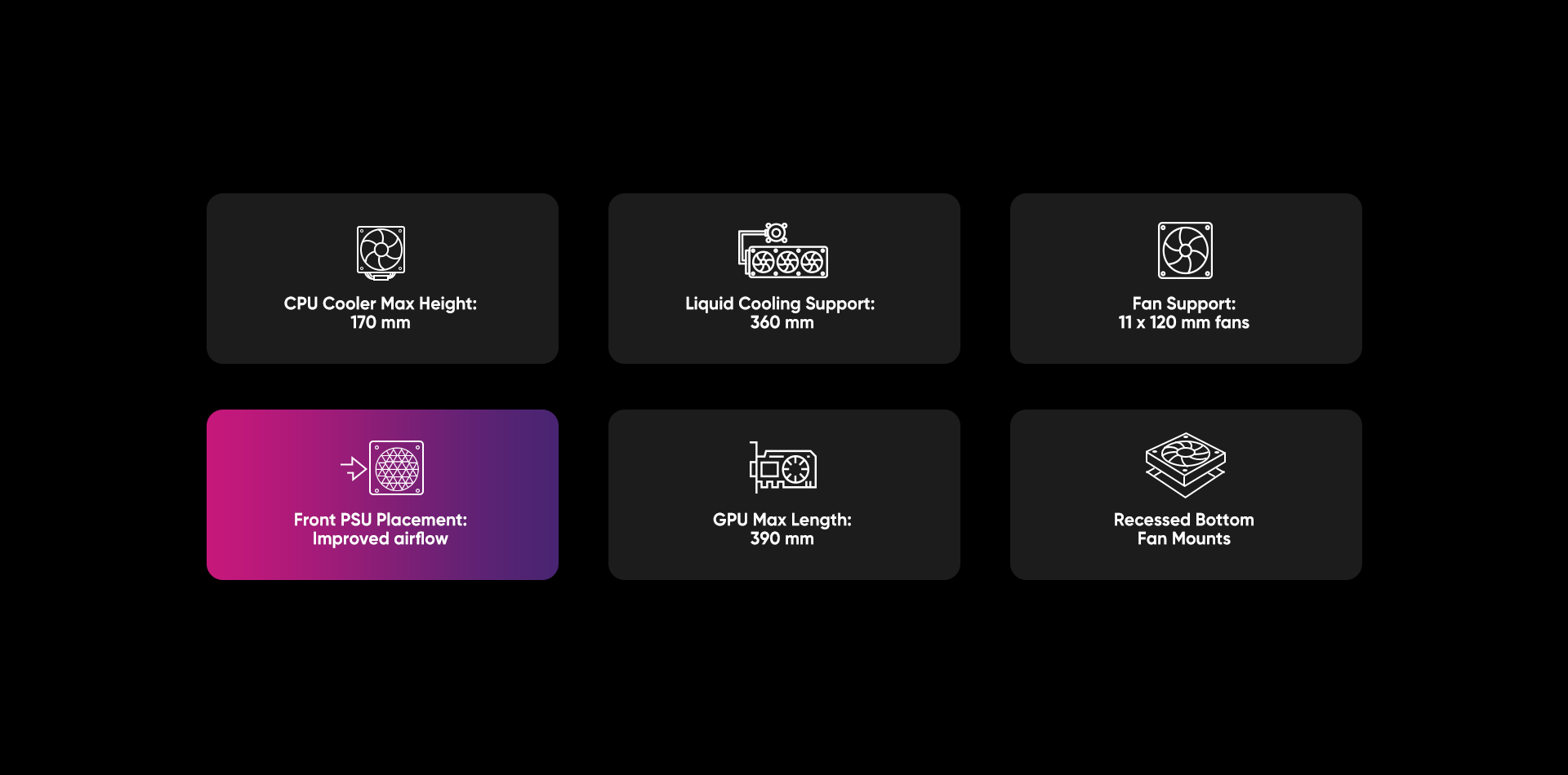 Bottom-front PSU placement allows for increased airflow beneath the fans and enhances GPU heat dissipation