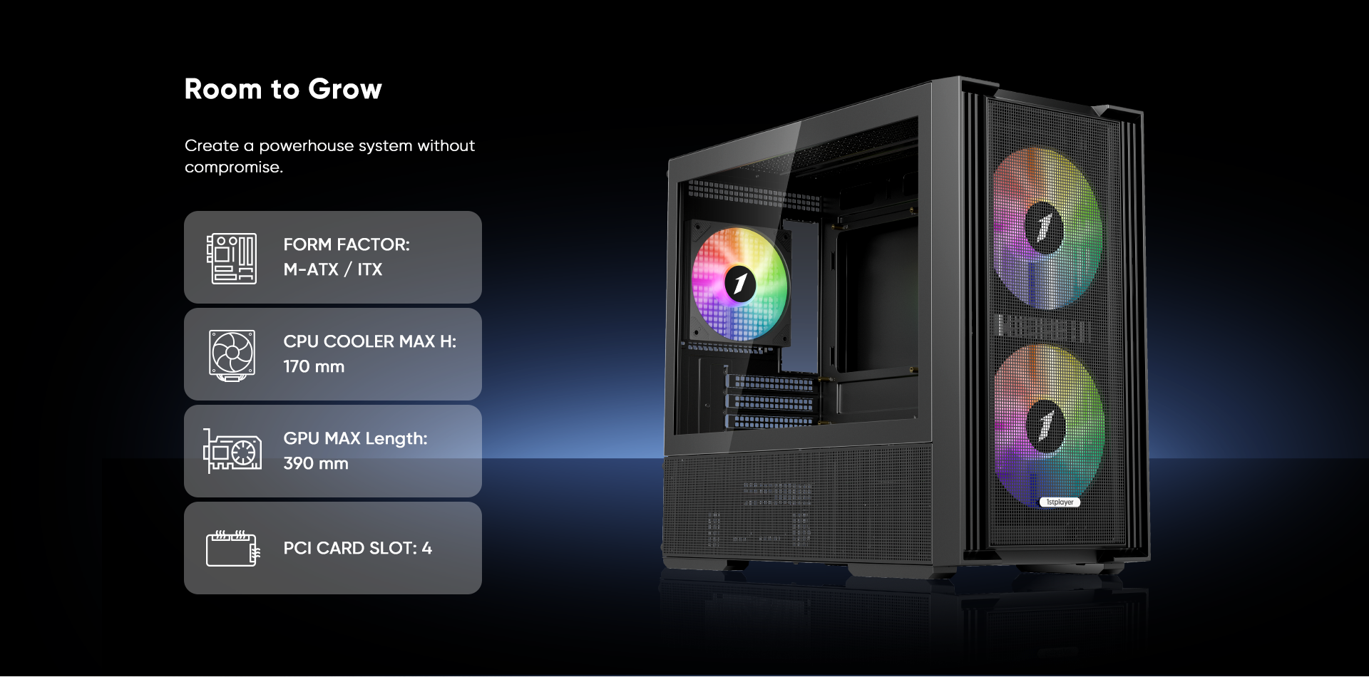 Recessed bottom fan mounts ensure installed fans sit flush with the case