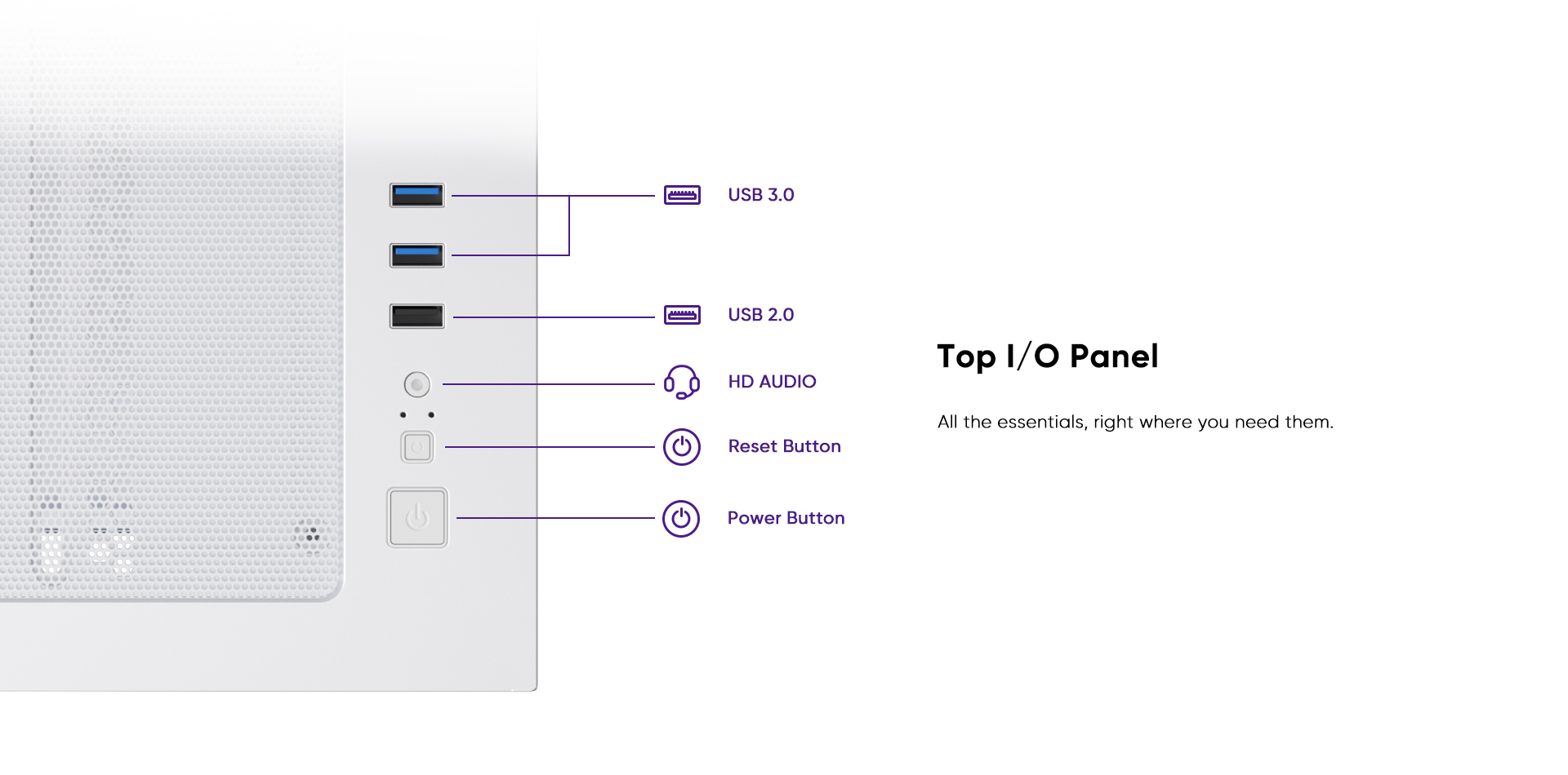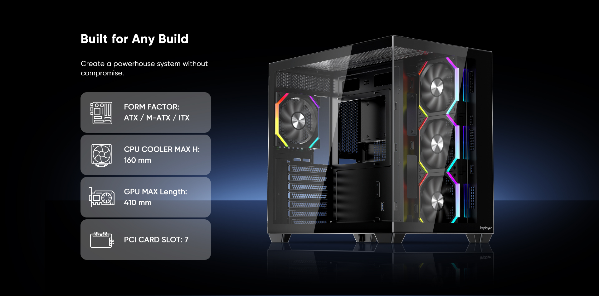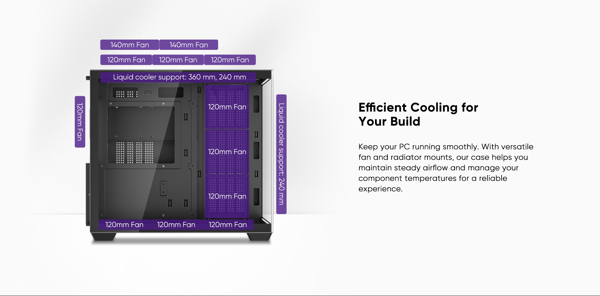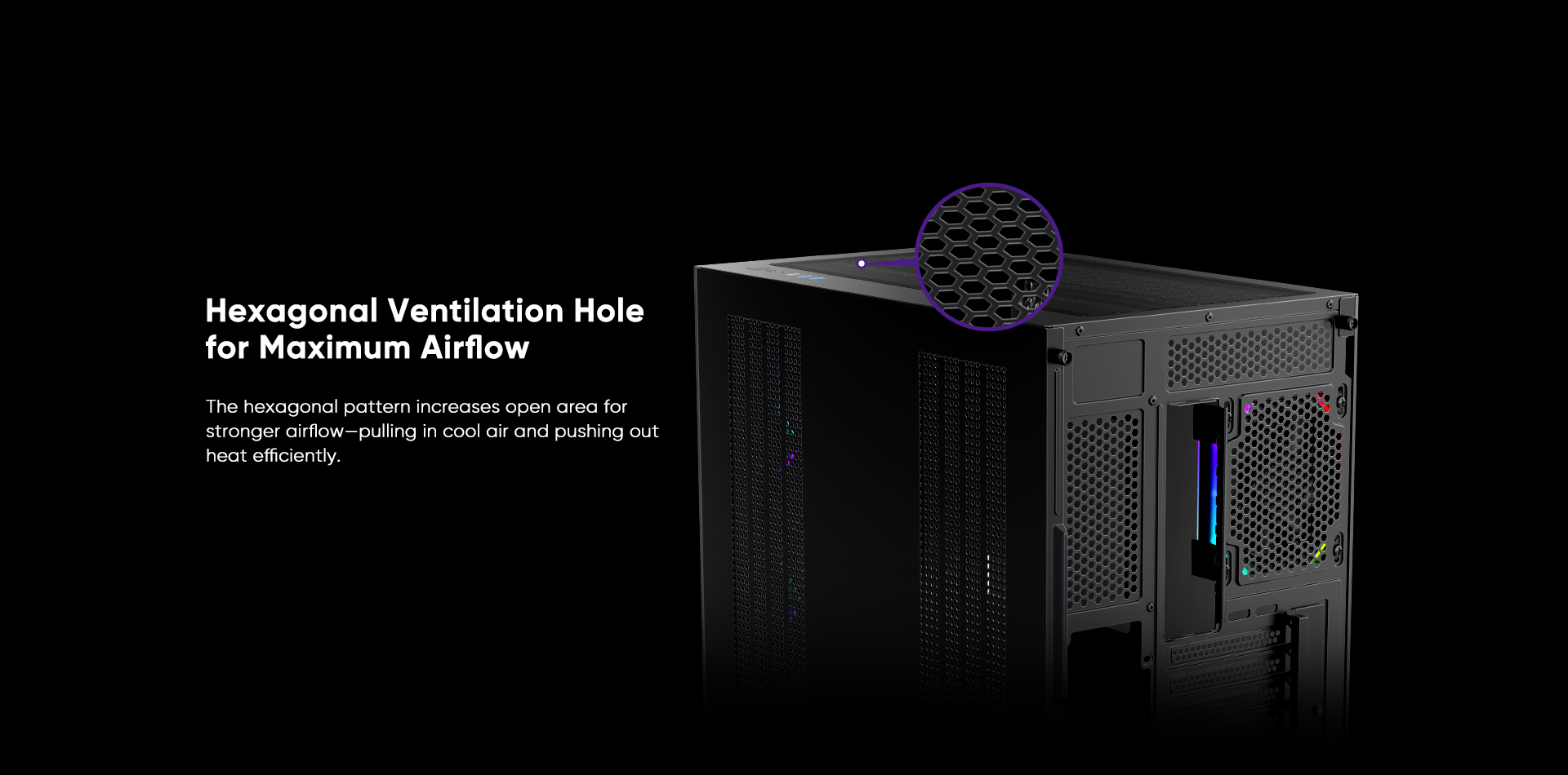 Front and side panoramic tempered glass panels,designed to deliver an uninterrupted wide-angle view of your components