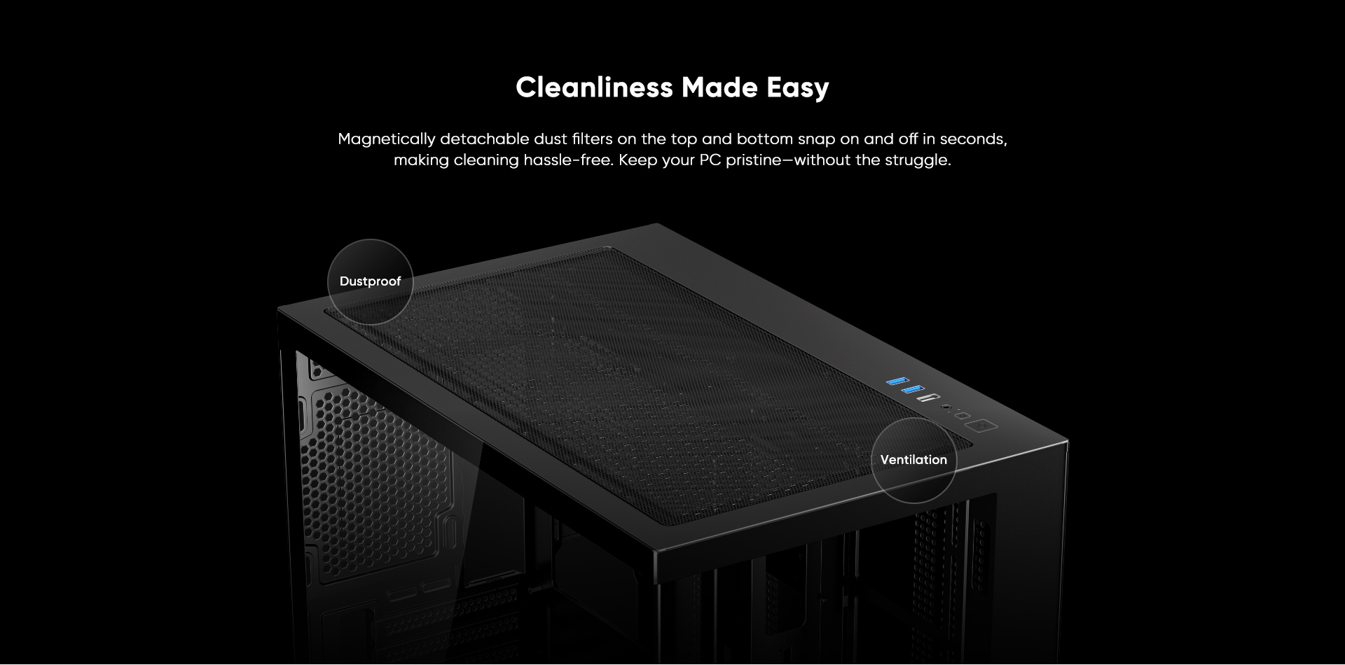 Magnetic-mount dust filter on the top and bottom for easy maintenance