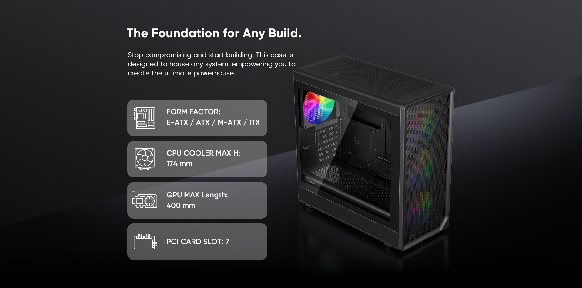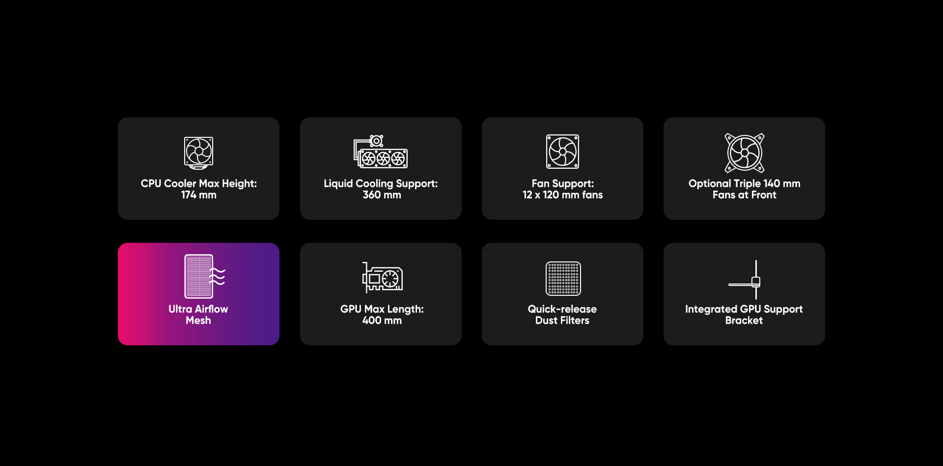 Magnetic-mount dust filters on both top and bottom simplify dust cleaning and upkeep