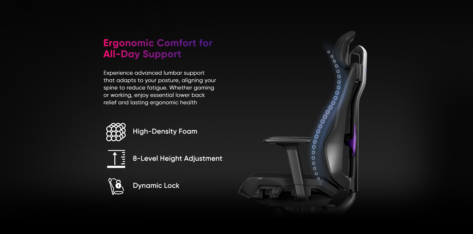 Lumbar Support: High-density foam, 8-level height adjustment dynamic lock