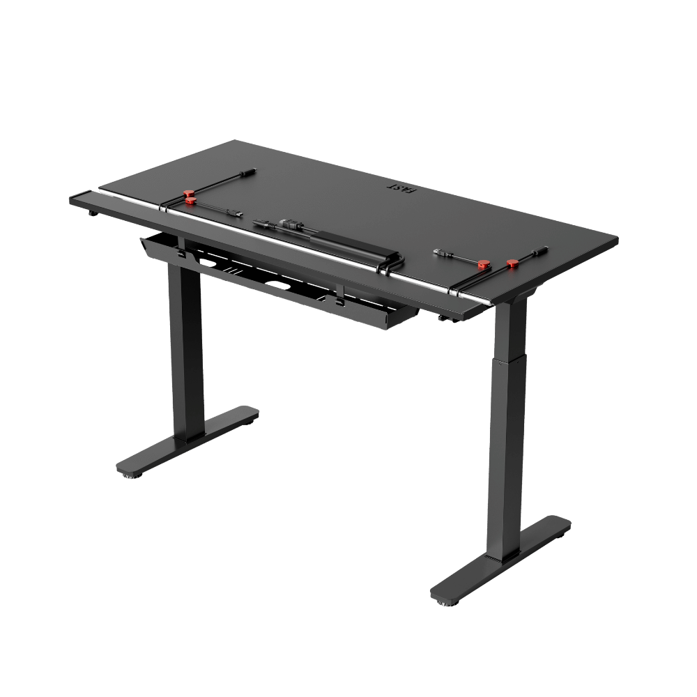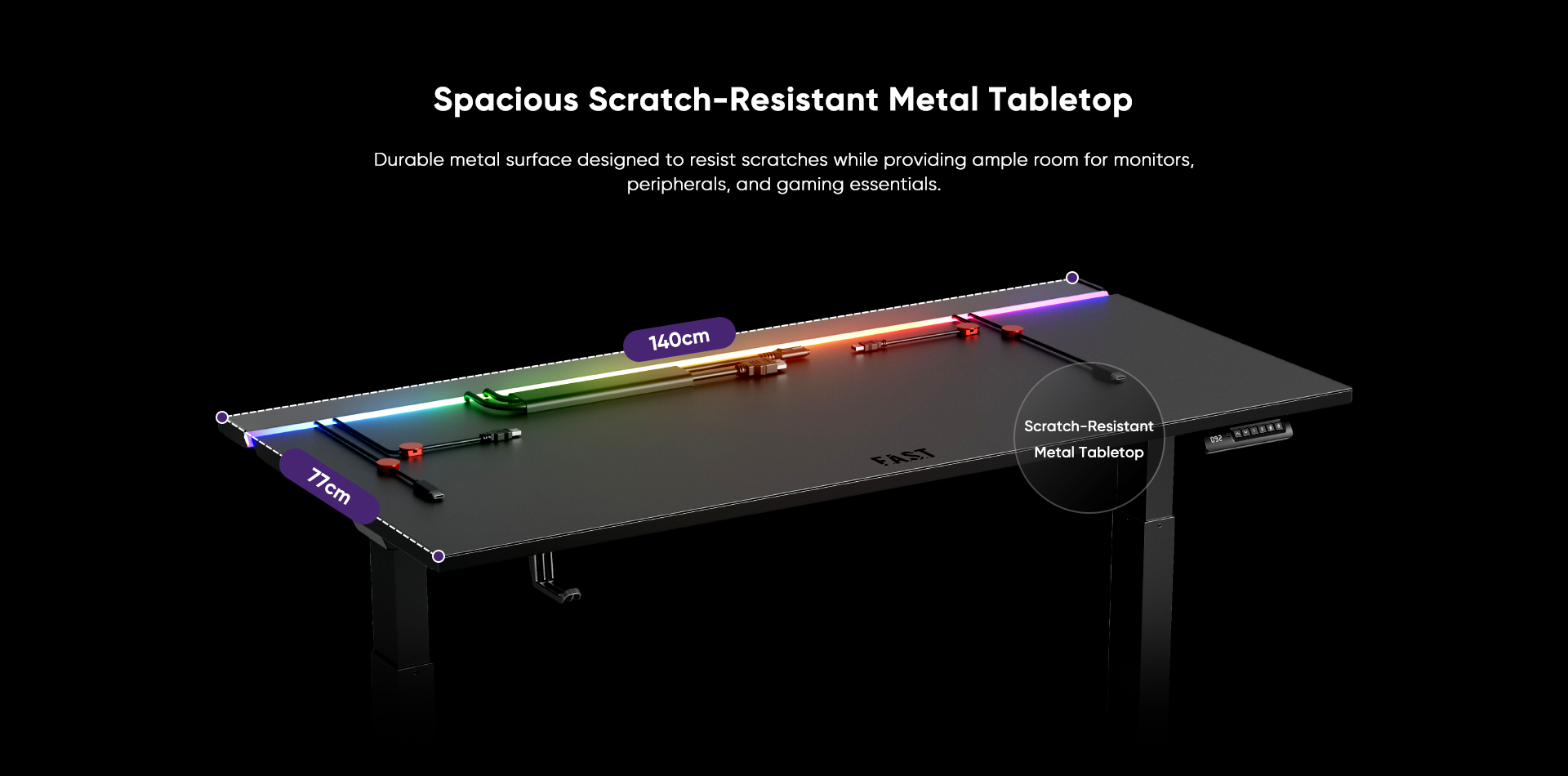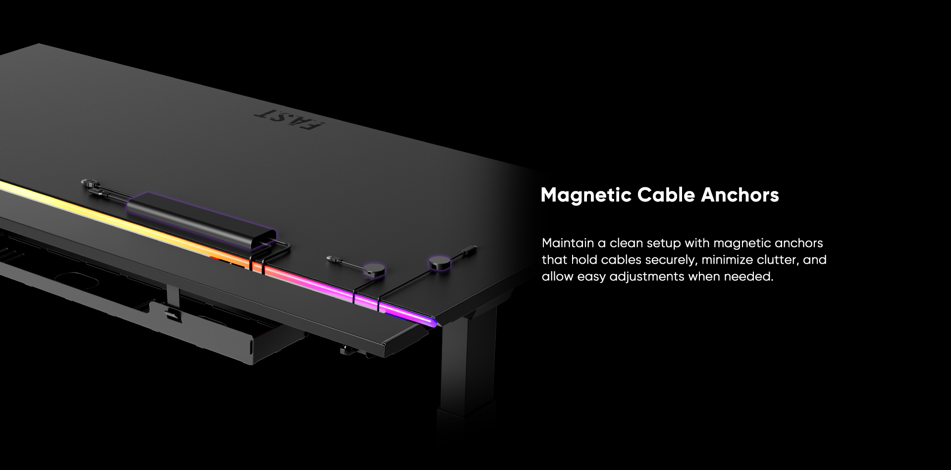 Metal anti-scratch desktop with magnetic cable anchors for a clutter-free desk space.